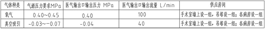 13、各种气体气源压力要求、医气输出口压力、流量参数、医气输出口种类及数量见下表: