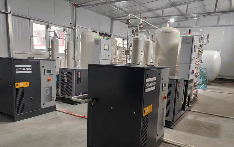 医用制氧机,使用空压机收集环境空气,通过分子筛选出氧气储存和供应,氧气浓度约93%,输送至管道的压力大约0.5map.