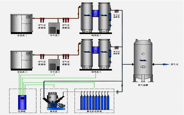 医院中心压缩空气系统机组一般采用螺旋杆空压机、冷干机、过滤器、储气罐等设备组成,通过管道连接至手术室、ICU、抢救室以及普通病房。