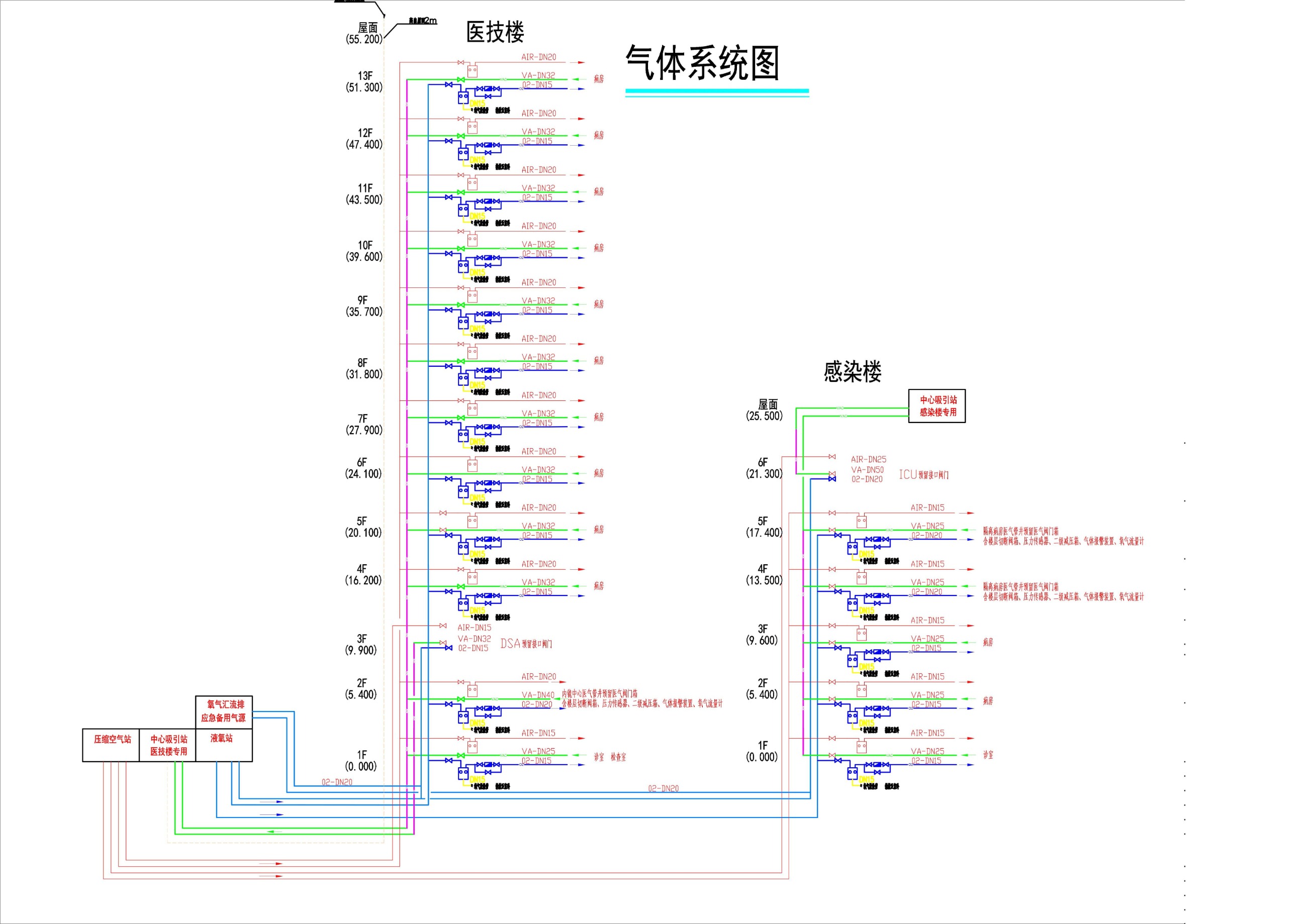 中心供氧系统由氧气站、供氧管道、稳压箱、阀门、氧气终端、报警装置、湿化瓶或呼吸机组成;压缩空气系统主要由空气压缩机、储气罐、干燥机、过滤器、输气管道、阀门组成;负压吸引系统的配置原理与供气系统相同,由吸引站、输气管道、检测报警装置和吸引设备组成。