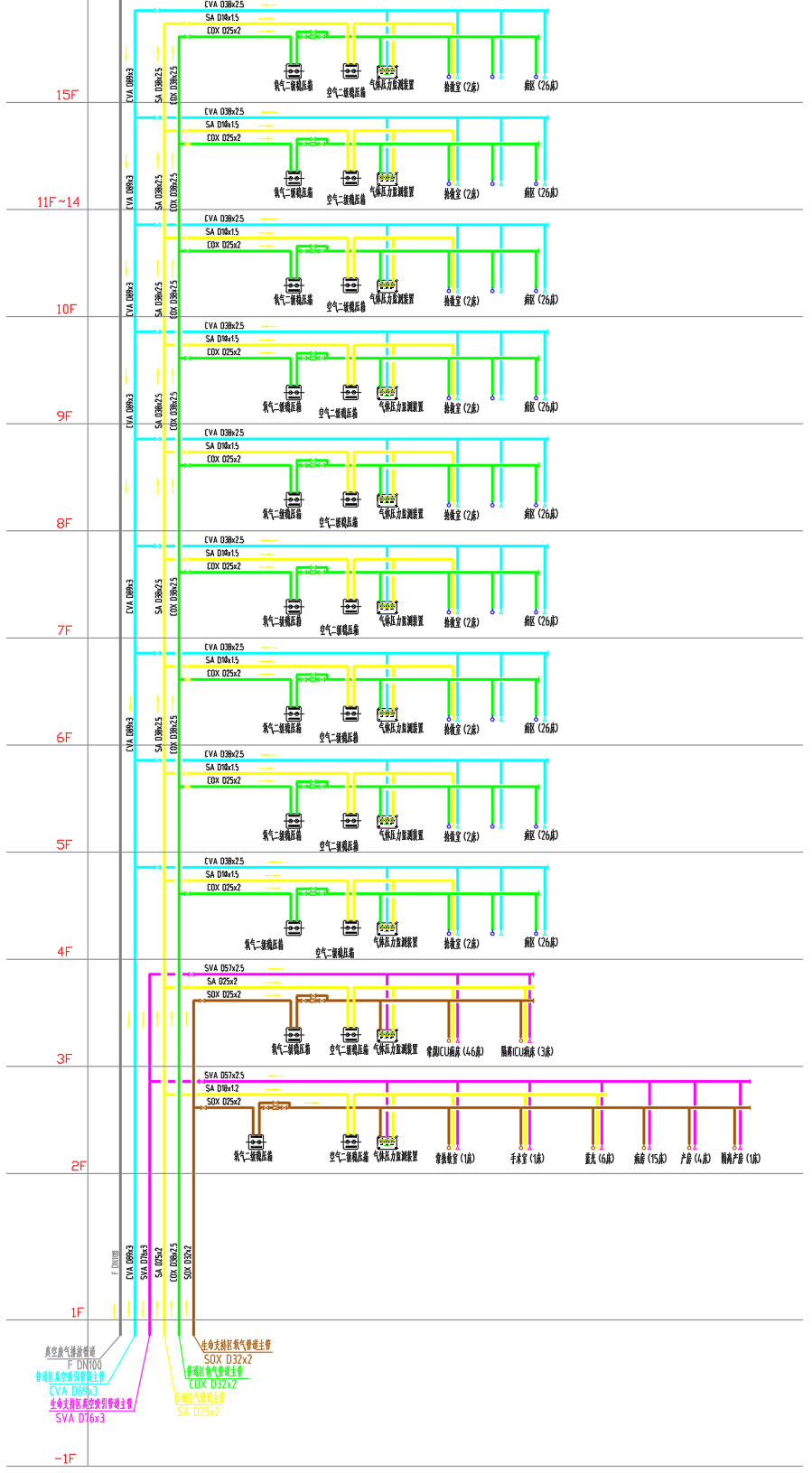 本项目为北京某三家医院3#住院楼项目的医用气体设计。包括普通区氧气管道系统、生命支持区氧气管道系统、普通区真空吸引管道系统、生命支持区真空吸引系统、医疗压缩空气管道系统系统设计。普通区氧气管路由院区液氧站提供、生命支持区氧气由院区氧气汇流排提供;真空吸引系统由院区真空汇提供;医疗压缩空气系统由院区制氧站提供。