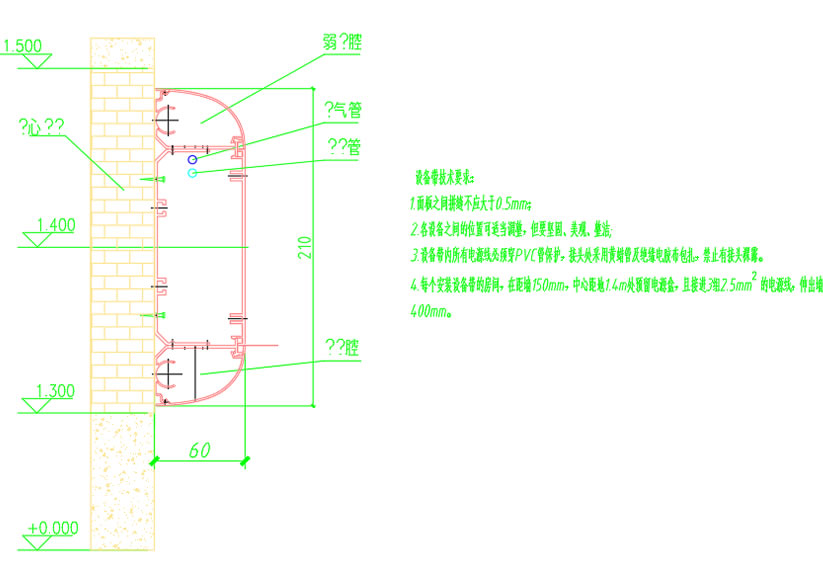 4.每个安装设备带的房间,在距墙150mm,中心距地1.45m处预留电源盒,且接进3组2.5mm²的电源线,伸出墙400mm。